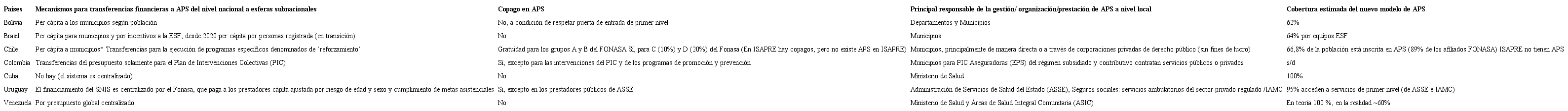 En los nuevos modelos, los servicios de APS en general tienen función de filtro a la atención especializada. La responsabilidad por la gestión y provisión desde la APS es distinta en cada país, concerniente al grado de descentralización del sistema de salud y de los segmentos de cobertura. Para los segmentos de cobertura pública tiende a no haber copagos (excepto Bolivia y Chile), y las transferencias entre entes gubernamentales es per cápita en tres casos en que el sistema es descentralizado (Bolivia, Brasil y Chile). En los otros países el financiamiento combina recursos fiscales y de la seguridad social en distintos diseños organizacionales. Con los cambios políticos nacionales o locales en la segunda década de los años 2000, los nuevos modelos de APS vienen sufriendo discontinuidades, pero aun así algunos abarcan coberturas expresivas en varios países (Cuadro 5).