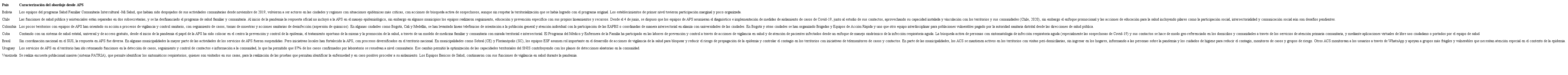 Con la mencionada excepción de Cuba, y en alguna medida la de Venezuela, el papel asignado a la APS en etapas tempranas de la pandemia no ha sido priorizado, disperso y con escasa articulación con la atención hospitalaria y las acciones de vigilancia epidemiológica. Ahora bien, con el devenir de los meses, y el acelerado crecimiento de la mortalidad, se aprecian distintas respuestas organizadas tanto a nivel nacional como en territorios, comunidades y equipos locales de APS. La mayoría de los países estudiados se han visto en la obligación de adoptar algún tipo de enfoque de APS, sea formalizado o no. No siempre se han organizado sistemas y equipos interdisciplinares de APS propiamente dichos, sino respuestas basadas en Brigadas o Equipos de Reacción Rápida coyunturales y más o menos improvisados (Colombia y Bolivia).
