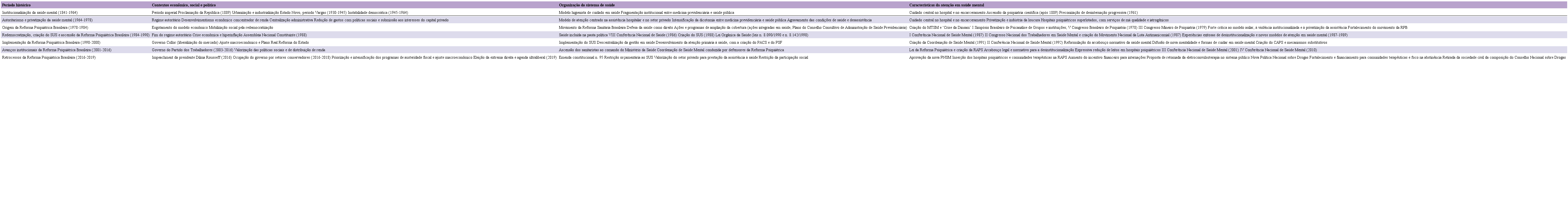 A trajetória das políticas e ações de saúde mental no país foi analisada tomando por referência os contextos: econômico, social e político; de organização dos sistemas de saúde; e dos aspectos normativos e legais. Com base nesses critérios, foram sistematizados sete períodos apresentados a seguir. No Quadro 1 estão dispostos os principais aspectos de cada período.