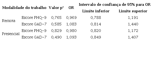 Os escores do PHQ-9 e GAD-7 para as áreas ou formas de atuação tiveram a hipótese de distribuição de probabilidade normal rejeitada pelo teste de Shapiro-Wilk, logo a técnica utilizada foi a não paramétrica. Não houve diferença mediana nos escores do PHQ-9 e GAD-7 entre as formas remota ou presencial pelo hospital (Tabela 3).