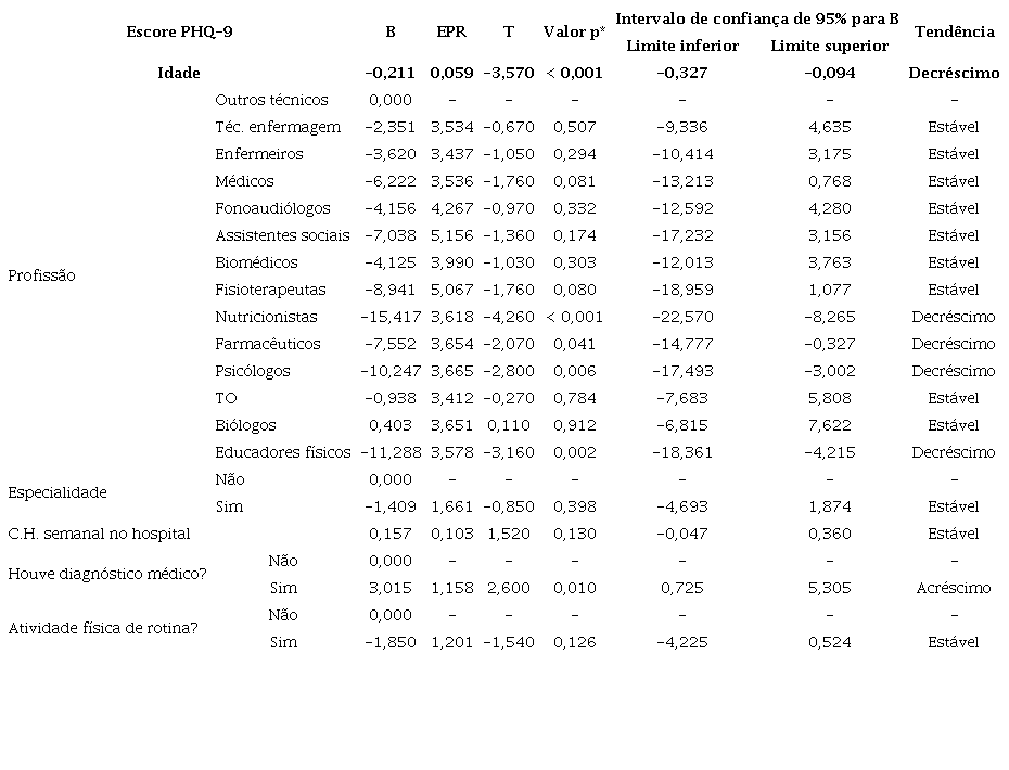 ‘Idade’, ‘profissão’ e ‘diagnóstico médico de Covid-19’ apresentaram associação significativa com o escore PHQ-9 e o GAD-7. Assim, de acordo com o aumento da idade, há uma tendência de decréscimo na média do escore PHQ-9 e do GAD-7. As profissões nutricionista, farmacêutico, psicólogo e educador físico apresentaram uma redução média no escore em comparação a outros técnicos. E aqueles com diagnóstico médico confirmado da Covid-19 tiveram influência em acréscimo no escore em comparação com quem não obteve tal diagnóstico (Tabela 5).