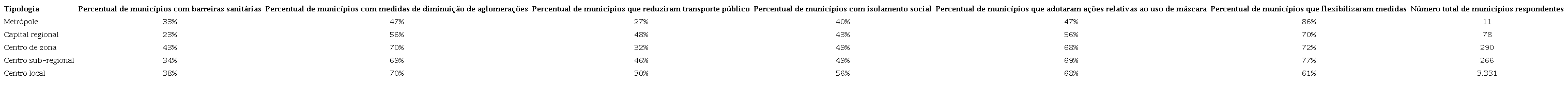 No que toca à análise por tipologia de município, constata-se que houve baixo percentual de municípios que adotaram medidas de enfrentamento da pandemia de Covid-19, principalmente aqueles classificados como capitais regionais e metrópoles. Ressalta-se que a grande maioria da população brasileira vive nesses municípios, altamente conectados na rede de cidades e que apresentam intensas dinâmicas metropolitanas de circulação de pessoas. Dentre os municípios que tomaram alguma medida contra o Covid-19, tais como a implantação de barreiras sanitárias, medidas restritivas para diminuição da circulação/aglomeração de pessoas, medidas de isolamento social, permitindo apenas serviços essenciais, uso obrigatório de máscaras faciais e redução da oferta de transporte público, a maioria suspendeu as ações ao longo do tempo.