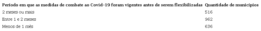 Dos 3.976 municípios pesquisados que implementaram alguma medida não farmacológica de combate à pandemia, identificou-se que 2.114 optaram por alguma flexibilização e 1.862 afirmaram que não adotaram medidas de flexibilização. Os dados mostram que 516 (24%) deles flexibilizaram as medidas após dois meses ou mais, e 962 (46%) entre trinta e sessenta dias após o decreto. É interessante observar que 636 municípios (30%) suspenderam as medidas imediatamente, com menos de trinta dias após o decreto ( Quadro 2).