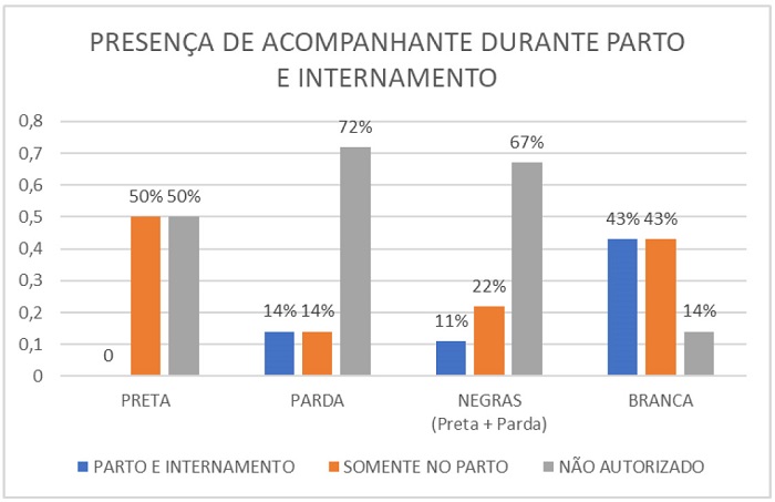 Nesta pesquisa, apresentaremos dados que demonstram que a proibição de acompanhante pelas instituições de saúde que internam para o parto aconteceu em maior número entre mulheres negras, ou seja, o recorte racial foi definidor na determinação de quem poderia ou não ter garantido seu direito. O rigor dos protocolos de segurança contra a Covid-19 variou de acordo com o tom da pele da mulher atendida pelo serviço de saúde.