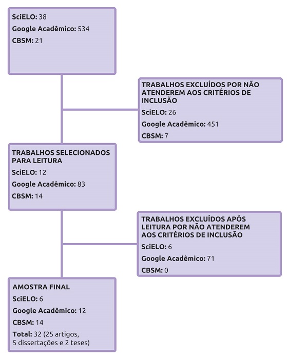 Após a etapa exploratória realizada no Google Acadêmico, por se tratar de uma plataforma de busca mais ampla, optou-se pela inclusão dos descritores “atenção psicossocial” e “reforma psiquiátrica”, além de “recovery”, de modo a se conferir um recorte mais específico, com uso dos filtros de língua portuguesa e temporal de 2011-2020. Nessa busca, encontramos 534 produções acadêmicas. Excluídos os resumos de anais de congresso e as publicações que não abordavam de fato o conceito, apenas 83 produções, entre artigos, dissertações e teses, foram pré-selecionadas. Destas, 47 imediatamente excluídas por apenas citarem o conceito brevemente. Após a leitura dos 36 trabalhos restantes, somente 12 foram incluídos na revisão por terem abordado o tema de forma mais aprofundada, discutindo o modelo teórico com o objetivo de contribuir para a qualificação do cuidado em saúde mental no Brasil e suas implicações com a RPB, contribuindo para o objetivo desta revisão.