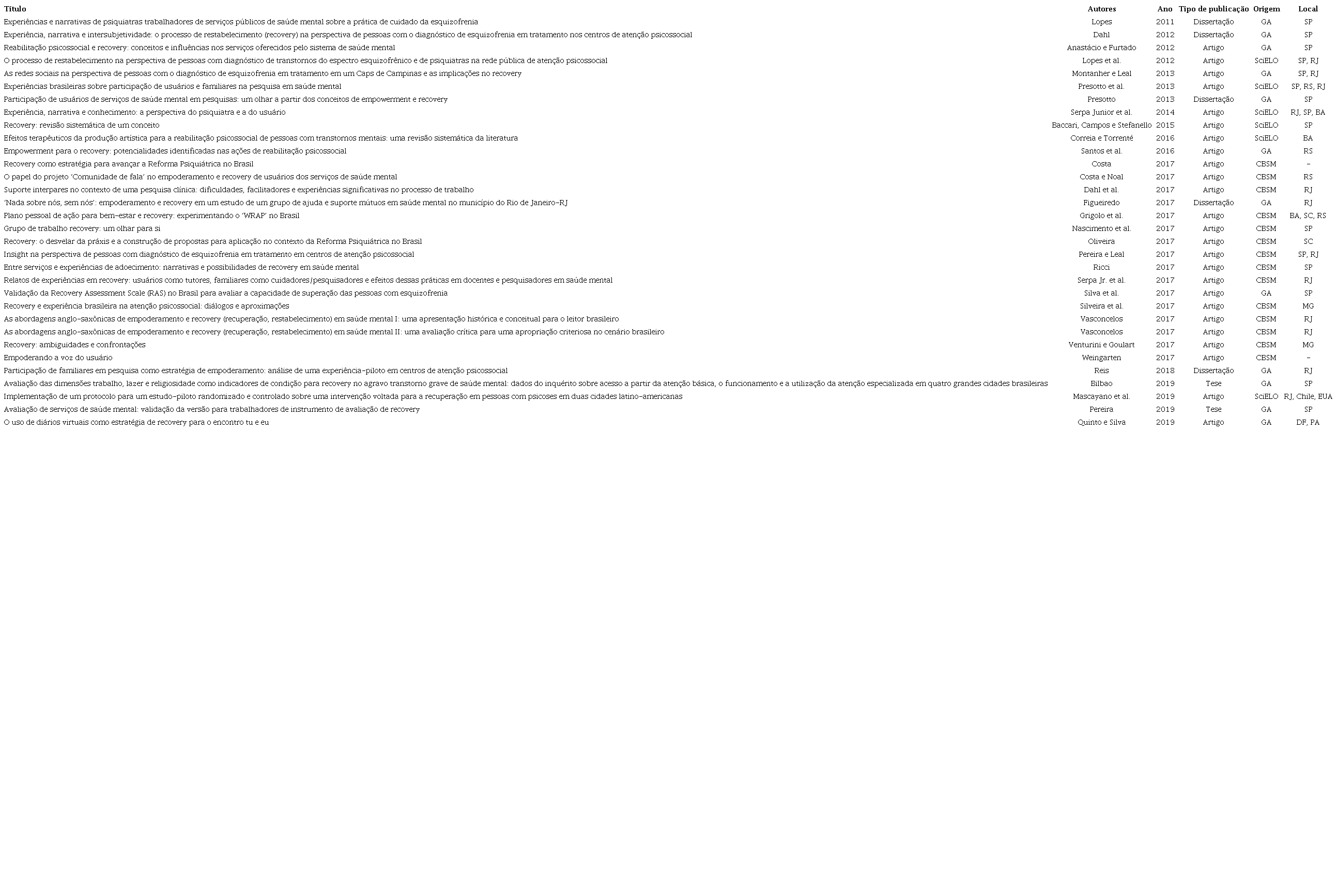 Verificou-se ainda que as publicações brasileiras sobre o conceito de recovery começaram a surgir a partir de 2011. Além de artigos publicados em periódicos, grande parte era referente a teses e dissertações, direcionando-nos à sua inclusão no presente estudo. Foi feita uma tentativa de busca no Catálogo de Teses e Dissertações da Coordenação de Aperfeiçoamento de Pessoal de Nível Superior (Capes), que não se revelou produtiva com os descritores utilizados, considerando os diversos sentidos atribuídos à palavra “recovery” e os limites de busca avançada da plataforma. Assim, optou-se por seguir o caminho de busca pelas bases SciELO e pelo Google Acadêmico.