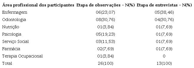 Na etapa de observações das atividades, 26 preceptores de sete núcleos profissionais participaram da pesquisa no período de julho a novembro de 2018. Dos 26 participantes das observações, 17 cumpriram o requisito para passar à etapa de entrevistas. Destes, dois não aceitaram participar, um desligou-se da instituição e uma estava de licença maternidade no período da coleta, totalizando 13 entrevistados de seis núcleos profissionais entre janeiro e julho de 2019. A Tabela 1 apresenta o detalhamento dos participantes por etapa, de acordo com a área profissional.