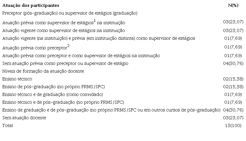 Os entrevistados apresentavam entre 6 e 36 anos de atuação profissional (média de 20 e desvio padrão de 10,3), entre 4 e 30 anos de atuação em saúde da família (média de 14 e desvio padrão de 5,0) e entre 1 e 15 anos como preceptores no PRMS/SFC (média de 9 e desvio padrão de 7,8). Quanto à formação acadêmica, 6 tinham especialização em saúde da família ou saúde pública, 5 eram especialistas e mestres e 2 eram especialistas e doutores. A Tabela 2 apresenta informações sobre a experiência com supervisão de estágios, preceptoria e atuação docente.