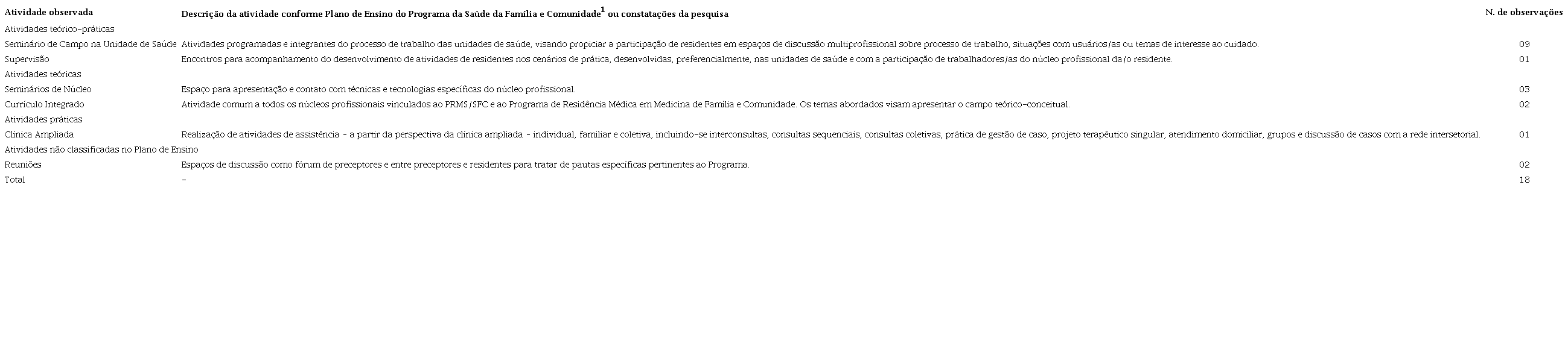 A esses foi enviado convite, esclarecendo os objetivos e detalhando a metodologia da pesquisa, a qual previa duas etapas sequenciais para coleta de dados: observações e entrevistas individuais. A etapa de observações objetivou identificar a mobilização de competências do referencial adotado (Rodrigues e Witt, 2013), correlacionando-as às atividades observadas. Os registros foram realizados com base em um roteiro estruturado que contemplava dados como data, local, atividade, temática e participantes, seguido de registro livre com as falas diretas dos preceptores, o contexto, a síntese das situações observadas, percepções da relação preceptor-residente, bem como as interpretações da pesquisadora sobre o observado.
