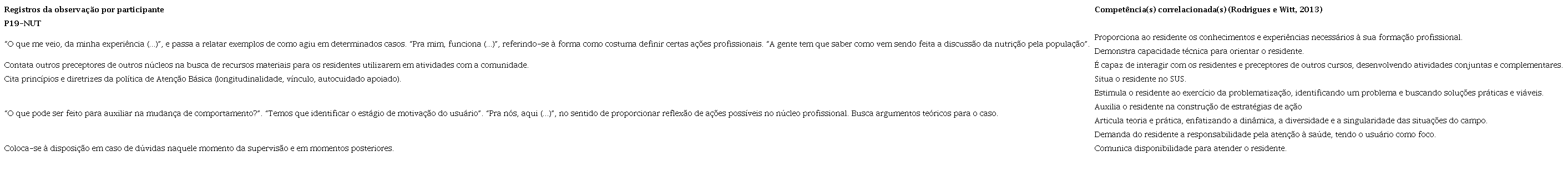 As interações e trocas entre preceptores e residentes foram destacadas em muitos depoimentos. Existe aprendizado, atualização e possibilidades de planejamento como consequência dessas trocas. Questionado sobre a competência “Demonstra capacidade técnica para orientar o residente”, o preceptor P19-NUT afirmou: “[...] o que eu sei, eu vou falar, se eu não sei, eu vou procurar na frente deles, junto com eles, porque a gente vai saber juntos” (P19-NUT).