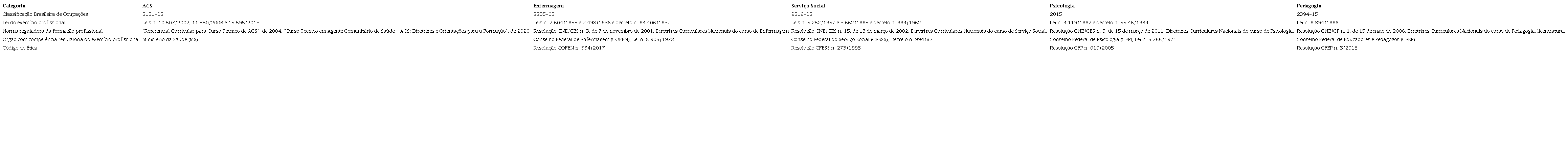 Aprofundando a investigação, foram analisados outros aspectos normativos que regulamentam a formação das ACSs em comparação à Enfermagem, Psicologia, Serviço Social e Pedagogia (Quadro 4).