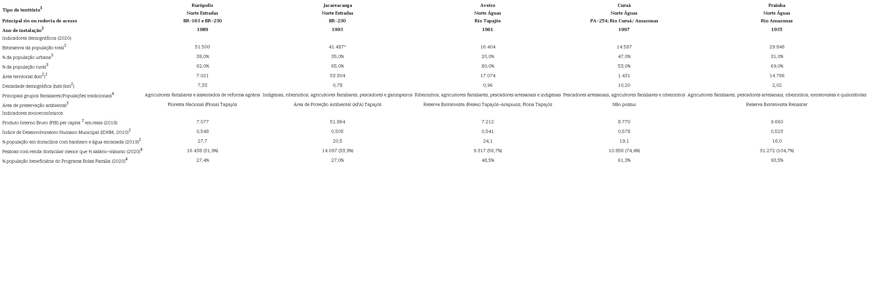 Dentre os oito MRRs da região, foram selecionados intencionalmente cinco municípios - Prainha, Aveiro, Curuá, Rurópolis e Jacareacanga - com diferentes características socioeconômicas e geográficas: extensão territorial, presença de populações tradicionais, Produto Interno Bruto (PIB) per capita, população em situação de pobreza e localização segundo fluxos fluviais ou terrestres.
