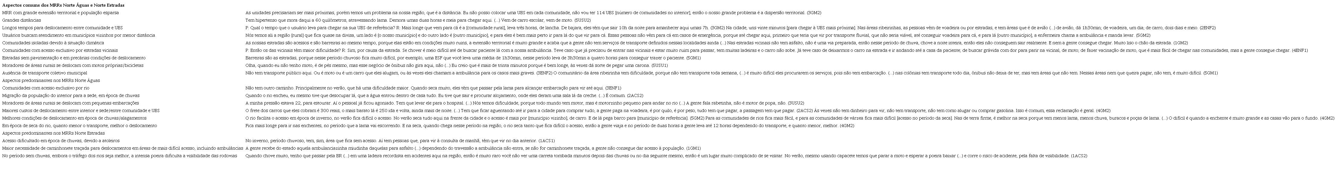 O Quadro 1 sintetiza aspectos comuns e predominantes de acessibilidade geográfica nos MRRs Norte Águas e Norte Estradas, ilustrados por falas significativas.