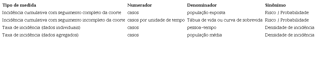 Em epidemiologia são considerados dois tipos de medidas de incidência, risco e taxa, diferenciadas pelo denominador. A primeira, na qual o denominador são pessoas expostas ao risco (risco), e a segunda, na qual o denominador são unidades de pessoa-tempo expostas ao risco (taxa). A incidência baseada em pessoas expostas ao risco é chamada de incidência cumulativa e se o tempo de exposição for igual para todos, ou seja, se o seguimento for completo, é expressa pelo número de eventos dividido pela população exposta. Se, como ocorre frequentemente, o tempo de seguimento não é o mesmo para todos, a incidência será expressa pela função de sobrevida ou sobrevivência cumulativa. A segunda, chamada taxa de incidência, é expressa pela divisão do número de eventos por unidades de pessoa-tempo de exposição e corresponde à densidade de incidência.