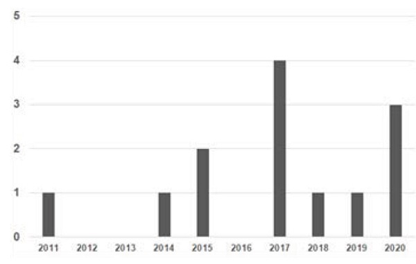 Quanto ao ano de publicação dos artigos, tem-se a maioria deles (30,77% - quatro artigos) de 2017, seguido por 23,08% (três) de 2020, 15,38% (dois) de 2015 e os demais de 2018 (7,69% - um artigo), 2019 (7,69% - um), 2014 (7,69% - um) e 2011 (7,69% - um artigo) (Figura 3). Todos os artigos selecionados utilizaram a metodologia qualitativa. Assim, pode-se notar um aumento de publicações dessa temática nos últimos anos, apesar de mais estudos ainda serem necessários.