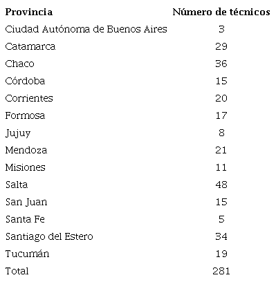 En Argentina, desde el año 1962 existe un Programa Nacional de Chagas (PNCh) que nuclea las políticas públicas relacionadas con el acceso al diagnóstico y tratamiento de la infección, el control de las transfusiones de sangre y de los insectos vectores, y las acciones en torno a la educación y difusión de esta problemática (Sosa Estani et al., 2006). Particularmente, las personas que realizan el control vectorial (identificación de vinchucas, rociado de las viviendas con insecticidas y registro de datos) son los técnicos de campo, a quienes también se los conoce como ‘vinchuqueros’, ‘chincheros’ o ‘chagueros’. Estos actores son contratados específicamente para ejercer estas funciones por los ministerios y secretarías de salud de la nación, las provincias y/o municipios. Actualmente el PNCh, que depende de la Dirección de Control de Enfermedades Transmitidas por Vectores del Ministerio de Salud Nacional, cuenta con 281 técnicos de campo varones distribuidos en 14 provincias argentinas (Tabla 1).