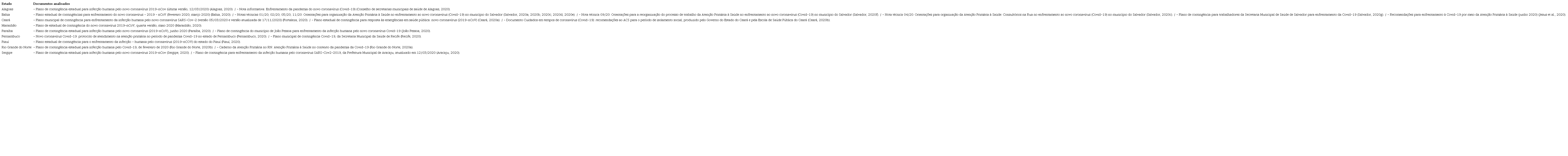 Analisaram-se os documentos estaduais de Alagoas (Conselho de Secretarias Municipais de Saúde de Alagoas-Al, 2020; Alagoas, 2020), Bahia (Bahia, 2020), Ceará (Ceará, 2020a, 2020b), Maranhão (Maranhão, 2020), Paraíba (Paraíba, 2020), Piauí (Piauí, 2020), Rio Grande do Norte (Rio Grande do Norte, 2020b) e Sergipe (Sergipe, 2020). Não foi possível encontrar todos os planos municipais de enfrentamento à Covid-19 das capitais do Nordeste. Foram examinados apenas os de Fortaleza (Fortaleza, 2020), Salvador (Salvador, 2020a; 2020b; 2020c; 2020d; 2020e; 2020f; 2020g), Aracaju (Aracaju, 2020), João Pessoa (João Pessoa, 2020) e Recife (Recife, 2020). No estado da Bahia, o município de Salvador usou notas técnicas produzidas pela secretaria de Saúde (Salvador, 2020a; 2020b; 2020c; 2020d; 2020e; 2020f) e de um documento para trabalhadores (Salvador, 2020g), com recomendações em nível estadual para APS no estado baiano (Jesus et al., 2020). Sobre os estados de Pernambuco e Rio Grande do Norte, encontraram-se, ainda, protocolos específicos para a APS (Pernambuco, 2020; Rio Grande do Norte, 2020a).