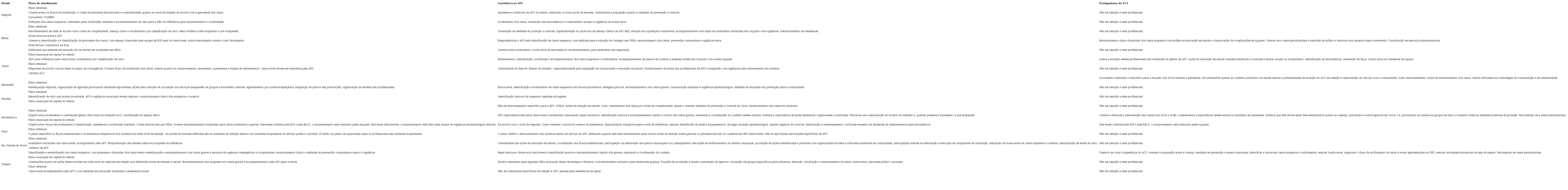 Algumas especificidades se fazem relevantes, como a orientação de extensão do horário de funcionamento de unidades de saúde, detalhada nos estados do Sergipe e Pernambuco. O estado do Rio Grande do Norte cita a participação da APS na elaboração dos planos municipais de enfrentamento à pandemia.