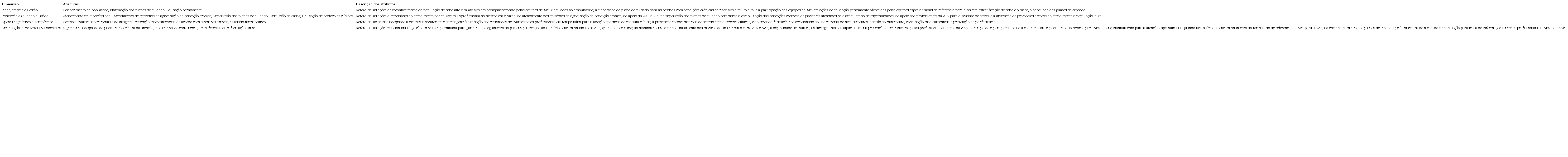 Neste estudo, realizou-se uma análise de implantação (Champagne et al., 2011), de abordagem quantitativa, dos macroprocessos da APS em três municípios das regiões supracitadas - Caxias (MA), Cristalina (GO) e Ji-Paraná (RO) - e na Região Leste do DF; e da AAE em dois municípios - Caxias e Ji-Paraná - e na Região Leste do DF. No município de Cristalina, a análise de implantação dos macroprocessos da AAE não foi realizada, pois na região do Entorno Sul a Estratégia PAS focou sua atuação apenas na APS. A análise considerou as dimensões Planejamento e Gestão; Promoção e Cuidado à Saúde; Apoio Diagnóstico e Terapêutico; e Articulação entre Níveis Assistenciais, categorizadas em atributos, conforme descrito nos Quadros 1 e 2.
