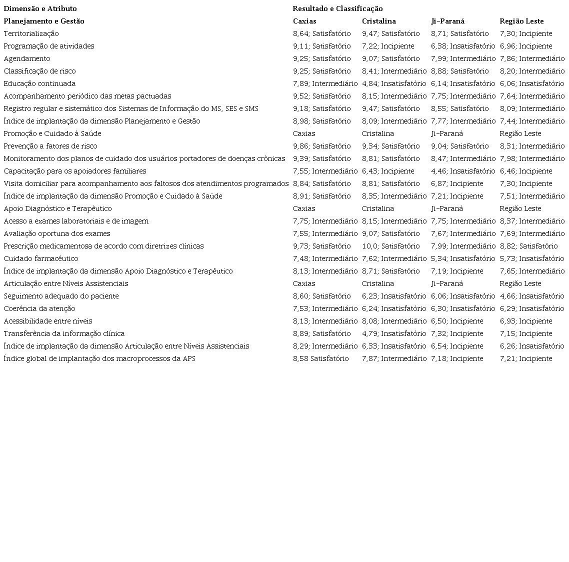O índice global de implantação dos macroprocessos da APS de Caxias obteve resultado ‘satisfatório’ (8,58); o de Cristalina, ‘intermediário’ (7,87); e o de Ji-Paraná e da Região Leste, ‘incipiente’ (7,18 e 7,21, respectivamente). Em geral, entre as quatro dimensões usadas para avaliar a implantação dos macroprocessos da APS, os melhores resultados foram obtidos por Planejamento e Gestão e Promoção e Cuidado à Saúde, e o mais frágil, pela Articulação entre Níveis Assistenciais (Tabela 1).