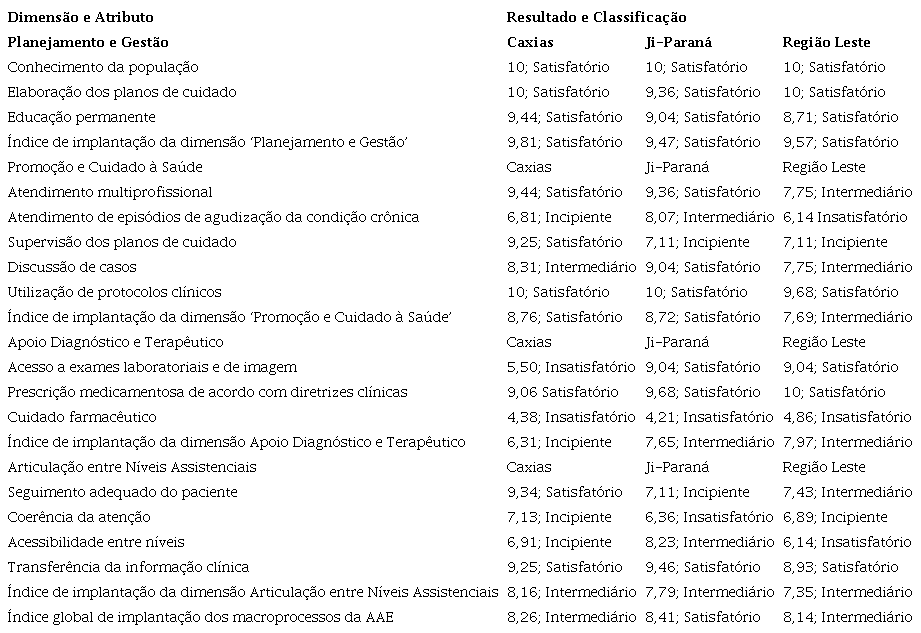Os resultados apresentados na Tabela 2 demonstram que Ji-Paraná obteve classificação ‘satisfatório’ (8,41), e Caxias e Região Leste, ‘intermediário’ (8,26 e 8,14, respectivamente). Em geral, entre as quatro dimensões utilizadas para avaliar a implantação dos macroprocessos da AAE, os melhores resultados foram obtidos pelas dimensões Planejamento e Gestão, com classificação ‘satisfatório’ em todos os atributos e localidades, e Promoção e Cuidado à Saúde, em que apenas a Região Leste não apresentou a classificação máxima. Por outro lado, apontaram-se maiores fragilidades em Apoio Diagnóstico e Terapêutico (Tabela 2).