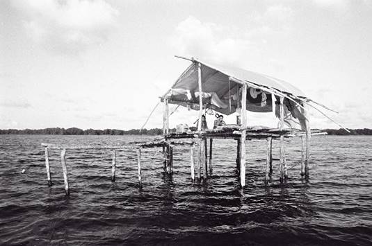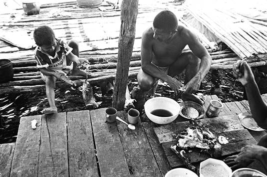 But the piranhas do not live just to eat. Not infrequently they themselves become food for the lake fishermen. In fact they comprise a stock of food always available under the stilt house, useful during bad weather or when the fisherman is panema, meaning the state of someone unable to fish (though depending on the intensity of the panemeira, even the piranhas may vanish).3 In normal situations, capturing them requires no more than dropping a hook and line or throwing a harpoon, a task preferentially assigned to children. Figuring among the preferred delicacies, either cooked or roasted over the fire, sliced opened lengthways still scaled, piranha is a catch generally consumed on the lakes themselves or back in the village, the broth made from the fish being widely proclaimed as a sexual stimulant.