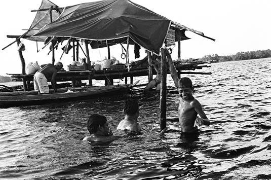 In fact, a wide range of interactions is present here and some kind of coexistence based on predation is even established between these two predators of the lakes. Although the fishermen cannot (and generally have no wish) to simply decimate the piranhas, including for the reason that they are not theirs to dispose of, neither are the fish considered a threat as such. True, this carnivorous presence under the stilt house causes the lake fishermen to adopt some precautions, but only to the extent of not jumping into the water when pitiú (imbued with the smell of recently handled fish) or at the moment when the piranhas are eating. Some avoid placing extremities like hands or feet in the water in isolation, which may be attacked like pieces of meat. Even when they take to the water, during the aquatic games, I never heard of any accident, aside from one case or other of someone being nibbled, taken as a mistake or exaggeration, understandable in a usually respectful but still reciprocally carnivorous conviviality.