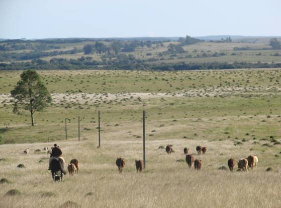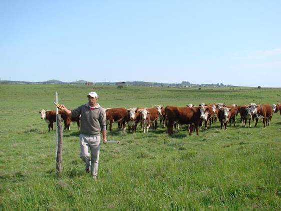 While the relationship between pampa people with oxen and sheep is distant, the relationship with horses and dogs is very close, as can be seen in the description of the routine of a farm located in the municipality of Aceguá in the micro-region of the Campanha of the state of Rio Grande do Sul, characterized by extensive cattle farming: chores begin at 6 a.m. when the sun begins to "peek" over the horizon, illuminating the green carpet that stretches over the bent fields. The dairy cows stand by the gate of the potreiro near the houses, which is a small area where the dairy cows and horses that are working in grazing activities are left. They wait for the pampas cowboy, responsible for domestic activities like slaughtering the sheep to be eaten on the farm's property, milking the cows, among others. Cows provide milk and in return gain ration. There has to be this reciprocity in order for the cows to allow the "milk to go down", otherwise they hide and the pampa cowboy cannot milk them because the milk does not come out of the teats. Meanwhile, the other pampas cowboys are preparing to start the field work. The day's task is to "run the field", i.e. to cover, by horse, the area where the cattle is. In this activity they analyze whether any cattle broke through the wire fence and crossed to another field, if there are any cattle "apesteada" (suffering some illness) or with ticks (boophilus microplus). According to their situation the cattle are brought in to be treated in the "mangueira" which is a corral made of stone, wood or surrounded by wires meant to secure the animals being managed.