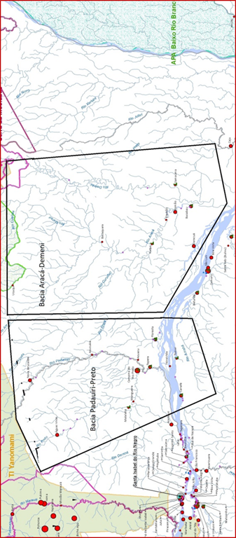Since 2001, political pressure mounted from the indigenous associations of the Middle Rio Negro and in 2007 the Fundação Nacional do Índio [National Indian Foundation] (FUNAI) established two technical groups for identification and delimitation: one in the Jurubaxi and Téa river basins (both on the right bank of the Rio Negro); and the other for the right bank of the Rio Negro including the Caurés, Quiunini and Aracá, Demeni, Preto and Padauiri river basins (these four are on the left bank), encompassing the municipalities of Barcelos and Santa Isabel do Rio Negro. The anthropological reports of both working groups were considered unsatisfactory by the National Indian Foundation and for this reason two other teams were created to redo the respective studies. The Jurubaxi-Téa Indian Land was declared in 2017. In this article I will concentrate on the processes of indigenous territorialization, ethnicity and activism in the field of scope of the Aracá / Demeni and Preto / Padauiri river basins, where I coordinated the identification studies,9 since late 2009. Sixteen communities were involved, embracing a majority Baré (72%) population, totaling 781 people.