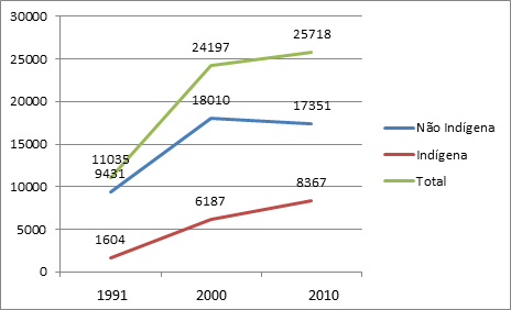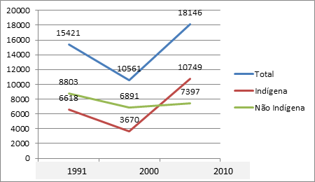As can be seen, the population of the municipality of Santa Isabel do Rio Negro decreased considerably in the 1990s, probably because of both migration (due to the presence of mining that restricted access to areas of natural resources essential to the sustainability of the communities), while the indigenous and total population of Barcelos grew considerably. We can thus deduce that a part of the total and indigenous population of the neighboring municipality migrated to Barcelos. In the following decade, the indigenous population of Barcelos grew at a slower pace, concomitantly to a sharp increase in the indigenous population of Santa Isabel (and even exceeded the non-indigenous population), which may have received a return of some of the indigenous people who had emigrated in the previous decade. This is very probably due to the intense flow and mobility of the indigenous groups on the Rio Negro, but which simultaneously sustained the absolute and relative growth of the indigenous contingent in both municipalities. We must also consider that, as we have indicated, the social conditions of public affirmation of ethnic identity had changed, encouraging more individuals to declare themselves to be indigenous in the censuses conducted by the Brazilian Institute of Geography and Statistics (IBGE). This explains the register of such a small portion of self-declared indigenous in 1991, when prejudice and discrimination were still very strong in the municipality, the indigenous movement had not increased and there were no specific public policies for the indigenous (in education and healthcare for example).