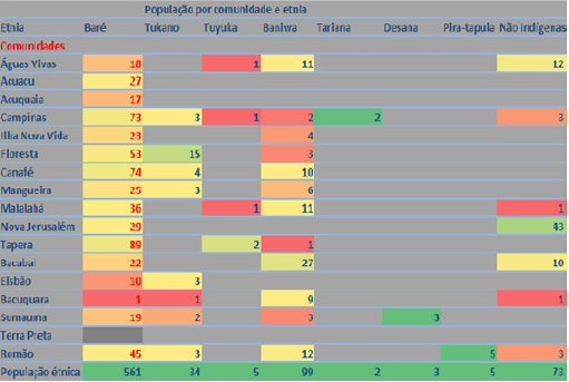 It should be remembered that the 1990s were especially difficult for the indigenous groups in the municipality because of the presence of gold diggers and miners who prohibited access to certain areas with resources essential to the indigenous communities and caused other problems such as criminality, violence, alcoholism, etc. (ISA 1996: 146-147). This situation was overcome with the demarcation and ratification of indigenous lands in the municipality in the second half of the 1990s; and later, after 1999, the implementation of the Special Indigenous Sanitary District, and the process of identification of Indigenous Lands after 2007 sparked the collective mobilization of ethnic identity.