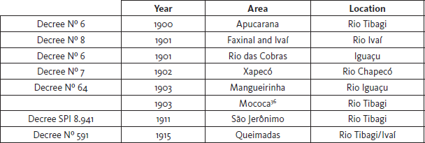 In the early twentieth century, in the first years of the Republic, still before the creation of the Indian Protection Service,33 the state governments of Paraná and Rio Grande do Sul issued decrees regulating the reserve of lands for the indigenous.34 In Paraná, between the years 1900 and 1915, decrees were promulgated reserving lands for the Kaingang in the regions of the Ivaí, Chapecó35, Iguaçu and Tibagi Rivers.