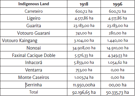 In Rio Grande do Sul, Kaingang retakings led to the state creating a working group to discuss the indigenous question. In 1997, the reports of this working group included a comparative chart with detailed information: an official tabulation of the expropriation of the indigenous lands demarcated at the beginning of the twentieth century XX.58