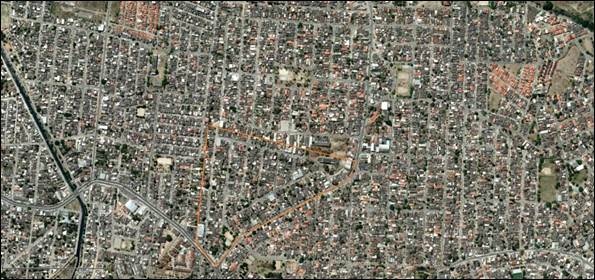 Hybrides, les « lotissements défectueux » (loteamentos irregulares)6 de la périphérie ne sont ni le fait du gouvernement, à l’image des « cités » (conjuntos habitacionais) dont l’existence à Rio de Janeiro remonte aux années trente, ni le produit d’une croissance dite « organique », comme ce serait le cas des favelas ; ils occupent en fait une région ambiguë dans les systèmes de classifications scientifiques et indigènes de l’espace urbain, quelque part entre les catégories de « ville informelle » et de « ville formelle », ce qui certainement explique leur moindre visibilité dans l’espace public. De ce fait, cet habitat intéresse peu les chercheurs, ce que Santos regrettait déjà au début des années quatre-vingt, quoiqu’il n’y eût jamais autant de travaux sur les lotissements, en particulier sur les lotissements cariocas, qu’à cette époque. Ainsi, dans les « lotissements défectueux » de la périphérie, l’autoconstruction cohabite avec l’agencement géométrique de l’espace: il suffit d’observer une vue aérienne de n’importe quel quartier de la Zone Ouest (Figure 1), souvent considérée comme « la périphérie de Rio de Janeiro », pour avoir une idée nette de longues rues rectilignes, qui se croisent en angle droit ; de ces pâtés de maison avec leurs constructions bien rangées de chaque côté ; de ces îlots (quadras) disposés à intervalles réguliers, de tailles souvent comparables sans être pour autant uniformes. Avec un regard attentif, on devinera que tout l’espace n’a pas été loti en une seule fois, qu’il y eut plusieurs opérations de lotissement, obéissant à des règles d’urbanisme différentes. Il y a comme une « apparence d’ordre » dans ces lieux, qui les distingue de n’importe quelle occupation dite « spontanée », comme il en va pour les favelas - l’Institut Brésilien de Géographie et Statistique (IBGE), l’équivalent brésilien de l’Institut National de la Statistique et des Études Économiques (INSEE), définit les « agglomérations sous-normales » (aglomerados subnormais), synonyme de favelas, comme des ensembles de maisons « disposées, en général, de façon dense et désordonnée », qui ont été urbanisés « en dehors des standards en vigueur », d’où « des voies de circulation étroites et d’alignement irrégulier, des parcelles de tailles et de formes inégales »7.
