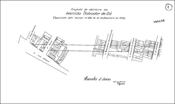 C’est donc sur la base d’artefacts graphiques que, trente années après, Pereira Passos ordonna la fameuse réforme urbaine (1902-1906) qui lui valut son surnom de « Haussmann tropical ». D’ailleurs, la réforme de l’infrastructure documentaire sur laquelle prenait appui l’administration municipale précéda la politique des grands travaux: alors qu’il n’était même pas encore maire de Rio, Pereira Passos réorganisa les services qui s’occupaient de ce que nous appellerions aujourd’hui l’urbanisme, nommant exclusivement des ingénieurs. Il mit au centre de sa nouvelle administration la Commission de la Carte Cadastrale, faisant d’elle une annexe de la Direction Générale des Travaux Publics et de la Voirie - sous la gestion de Barata Ribeiro (1892-1893) débuta le relevé de la carte cadastrale, à la suite du recrutement de Manoel Pereira Reis, professeur d’astronomie à l’École Polytechnique de Rio de Janeiro (Reis 1977: 8). La commission, sous la direction de l’ingénieur Américo de Sousa Rangel, avait d’ailleurs élaboré plusieurs « plans d’amélioration » (planos de melhoramentos) - le Décret du 20 décembre 1897 avait déterminé que, « pour toutes les concessions et contrats à célébrer avec la mairie, qui toucheront à la voirie, ne seront acceptés que les tracés projetés sur des plans qui procèdent de la Carte Cadastrale », conférant déjà à la Commission un rôle important dans la gestion de l’urbanisation. Pereira Passos s’empressa d’utiliser les travaux de la Commission (idem: 17): l’importance que celle-ci a revêtue sous sa mandature nous rappelle que les plans ne font pas que projeter, ils suggèrent des interventions dans l’espace - les défauts d’une trame viaire ne sont jamais aussi apparents que sur un plan en vue aérienne. Enfin, Pereira Passos introduisit « l’uniformisation des projets d’alignement, aussi appelés projets d’améliorations, en feuille de toile impériale transparente, de 30 x 50 cm. Les projets étaient visés par les ingénieurs, par l’Ingénieur Chef et Directeur des Travaux Publics, et ensuite approuvés par le maire » (idem: 18). À partir de cette normalisation des projets d’alignement commença la série de documents connue aujourd’hui sous le sigle de PAA ou « Projet Approuvé d’Alignement ». Le premier PAA représente ainsi l’Avenue Salvador de Sá dans le centre de Rio, œuvre de la mairie elle-même (Figure 4). En tout, la gestion Pereira Passos approuva près de 196 projets d’alignement, toujours en rapport avec des travaux commandités par la municipalité elle-même, telle que la construction des avenues Mem de Sá et Beira-Mar. Sous les administrations suivantes, les mêmes plans servirent à encadrer l’initiative privée: les opérations de lotissement, dans la mesure où elles créaient de la voirie, apparaissant alors en tant que « projets de voirie » (projeto de arruamento), lesquels faisaient partie de la série des PAA (Figure 5).