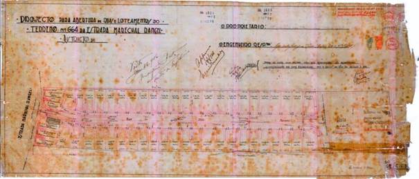 Il se trouve que les lotissements de Rio de Janeiro dérivent d’un « artefact graphique » (Hull 2012) appelé « Projet Approuvé de Lotissement » (PAL): il s’agit essentiellement de plans (Figure 2) sur lesquels figurent, numérotés et mesurés, rues, îlots et parcelles, de même que les signatures du propriétaire et de l’autorité municipale responsable pour l’approbation du projet. Avant d’exister physiquement dans l’espace urbain, les lotissements possèdent donc toute une existence documentaire dans une temporalité durant laquelle se construisent les relations entre les acteurs impliqués dans les opérations de lotissement: d’après la législation encore en vigueur aujourd’hui, le propriétaire du terrain à lotir doit soumettre aux autorités municipales un projet de lotissement, que celles-ci approuvent ou non ; les parcelles sont ensuite démarquées conformément au plan qui a été approuvé, lequel sert aussi à identifier chaque propriété lors de l’enregistrement des transactions chez le notaire. En d’autres termes, le PAL s’impose comme une « technologie » indispensable pour coordonner les différents acteurs du lotissement. Sur la base de recherches que nous avons menées sur les documents et le code de l’urbanisme à Rio de Janeiro nous prétendons faire ici la « généalogie » (Foucault 2004) de cette technologie, en identifiant les rationalités techniques et politiques qui ont présidé à son invention. Il ne s’agit donc pas, à l’instar des interprétations diffusionistes du plan orthogonal (Rose-Redwood 2008), de découvrir l’origine historique du lotissement, ni même de révéler une quelconque formule idéologique à l’œuvre derrière cette pratique. Ce qui nous intéresse en premier lieu, c’est le rôle du lotissement dans la « problématisation » de l’espace urbain, le rôle du lotissement en tant qu’outil d’action sur l’action des individus engagés dans la production de l’espace urbain - la dite périphérie se révèle justement l’un des principaux enjeux de cette problématisation. Ainsi, notre contribution s’inscrit tout autant dans le cadre des governmentality studies que de l’ethnographie des documents: nous soutenons en effet que la « raison graphique » (Goody 1979) à l’œuvre dans les documents d’urbanisme a joué un rôle éminent dans la conception et la résolution des problèmes liés au gouvernement de l’espace urbain. Il se trouve en outre que les deux aspects essentiels du lotissement, la création de voirie et la division du sol en parcelles, n’ont pas toujours reçu la même attention des pouvoirs publics: si dès le début de la colonisation le gouvernement a subordonné la création de voirie (arruamento) à des normes précises, la première réglementation (municipale) des opérations de division foncière en milieu urbain date des années trente. On commencera donc par décrire ces techniques visant à contrôler d’abord la création de voirie, en insistant sur le rôle des plans, des registres et des permis. Ensuite, on abordera la législation moderne sur l’alignement (alinhamento), cette pratique administrative qui consiste à démarquer la frontière entre le domaine, public, de la rue et celui, privé, des propriétés, car c’est de cette législation qu’est né tout l’appareil juridico-administratif en charge aujourd’hui du lotissement. Enfin, on s’intéressera à la réglementation du lotissement proprement dit, telle qu’on la trouve dans le « Code Godoy » de 1931 et le Code de la Construction de 1937.
