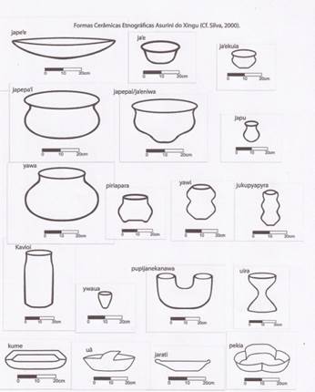 Passing through their villages it is possible to observe a profusion of objects spread throughout the spaces for domestic and ritual activities and in the areas used for disposal. They are various objects produced with raw materials and techniques specific to the Asurini as well as those produced from the incorporation of non-Asurini raw materials and techniques. These objects are joined by those that are industrialized (Silva 2013). Among their productions, the ceramic vessels - which they call pot - stand out for their beauty and their social and symbolic importance. They have various formal shapes that correspond to their functions (for ex. cooking, serving, consuming, transporting and storage) - as indicated in the chart below - and some are carefully painted with a broad variety of combinations of motifs related to Asurini cosmology (Müller 1990, 1992; Silva 2000).