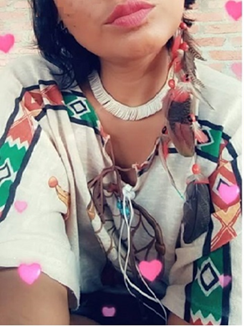 In Figure 1, nineteen year-old Kamilyi is wearing a commercialized ethnic-style T-shirt with Indigenous motifs, coupled with a white snail shell necklace and an elaborate, eye-catching feather earring. Her T-shirt is additionally decorated with a dream-catcher as the central piece, alongside red-and-green decorative patterns on the sleeves. Dream-catcher has origins in Native North American cultures and, after being taken as a symbol of unity in the Pan-Indian Movement of the 1960s and 1970s, it became a popular global commodity as one of the most culturally appropriated Indigenous objects - especially by the New Age movement (Snavely 2001). Her pose suggests a sensual selfie with subtle emphasis on her lips, the so-called “duck face photographic pose,” although without obvious make up.