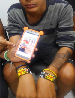 For example, eighteen year-old Kenny shows a serious and defiant facial expression (partly identifiable) with tightly closed lips, as he displays his neo-ethnic style beaded bracelets juxtaposed with ancestral symbols displayed on a smart phone signifying his ancestral affiliation, which apparently inspired his fashion choice (Figure 2). This juxtaposition of Kenny’s accessories with the ethnic symbol on a phone screen played the role of legitimizing his fashion choice and establishing a link between his personal ornamentation and the Indigenous legacy that inspired it. By implying that this was his own culture and legacy in this photo, he also conveyed a sense of pride and legitimacy - as one of the principal themes of Indigenous rights movements to invert racist stereotypes and value indigeneity - over what might otherwise be seen as cultural appropriation - a point that was also stated in the display of the Indigenous-pattern body painting on his left arm. While his bracelets, body painting and the screen image were meant to be the focus of the photograph, creating a semiotic of his cultural identification, his sporty hip-grey clothing stood out in contrast to the colorful neo-ethnic accessories, maintaining the glocal dynamic in his self-styling.