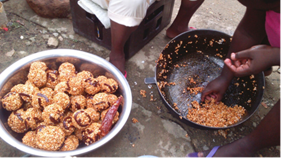 In the conversations with the Palenqueras I sought to map the beginning of their work with sweets and learned that their main economic activity was not always based on the production of the variety of sweets found today. It would not be possible here to offer precise historic data about each sweet in Palenquera cooking, but I sought to pay attention to the memory of the older people in the region. When I asked about this, I was told that sweets were always present in Palenque cooking, particularly the alegrías and the sweets that are made and consumed during Easter Week. The women with whom I spoke remembered that since they were young, sweets were part of family cooking, although their sale has taken place in the past six decades, because before this women were involved in other types of commercial activities, particularly the sale of fruits, fish, rice or root crops. Some of these products come from plantings in Palenque, raised by the men and sold by the women.