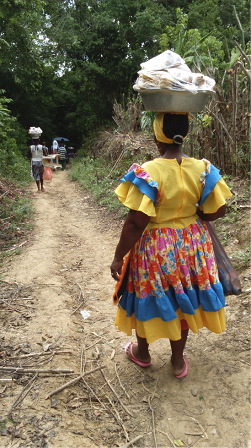Its 8:40 on a sunny Sunday morning, in the rural black community of San Basílio de Palenque, Colombia. Walking through the unpaved streets, people are seen moving about. Women, men and children go to the streets to obtain what they need for the day. They go out to buy supplies, to work, visit family. An intense flow of people, cars and goods is noticed on one of these busy Sunday outings. Sunday is a day of particular effervescence in this community. It is the day to receive tourists who come to discover un rincón de África1 in Colombia, it is a day for distant relatives to visit. It is the day for parties, drinking and champeta2. On the main square, the movement of various Palenquera women is noticed on their way to neighboring municipalities to work and return at the end of the day to their homes. They work selling different types of sweets, in various Colombian cities and in various bordering countries. They are recognized in Palenque as peddlers and pioneers.