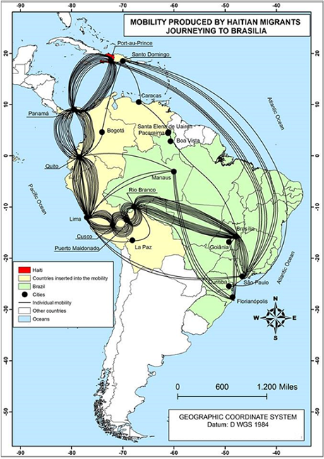 Abstract: This paper examines how Haitian migration connecting Haiti to Brasília is enacted through Latin America. The empirical data come from an ethnographic study of Haitians in Brasilia. Semi-structured interviews and focus groups were conducted with 34 migrants to reconstruct their mobilities. We explore how the Haitians’ historical practice of living on the move has enabled them to deal with border controls and develop tactics to circulate through several Latin America countries, including Brazil. We argue that their migration to the Brazilian capital can neither be understood as a linear movement characterized by an established Haiti-Brasilia connection nor defined as movement to a place where these migrants attempt to settle down. Rather, we show that the recent presence of Brasilia in the mobility of these Haitians has to be understood in the context of a vast dynamic meshwork of places, people and information.
