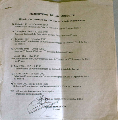 On April 18, 1986, Ulrick Rosarion, then Commissaire du Gouvernement (state prosecutor), issued instructions for the investigation of members of what he referred to as the “Duvalier criminal organization.” He nominated Emmanuel Dutreuil as the main investigative judge. The same year, a case was launched against Luc Desir for crimes that included murder and torture. The corruption case lingered and was reopened in 1999, 2008 and finally in 2011, when Jean-Claude Duvalier came back to Haiti and lived freely in his luxurious residence in Pétion-Ville. Starting in 2008, the case of corruption and bribery was supplemented with charges of crimes against humanity. Several dignitaries of the Duvalier regimes were mentioned in the case. Mèt Rosarion’s brother, Bernadin Rosarion, was accused of participating in financial crimes, crimes against humanity and “acts of corruption, abuse of authority, embezzlements of funds, gang association” (RNDDH 2012: 5). Mèt Rosarion remained only one month in the position of state prosecutor at the Court of First Instance, then he quit this political tribunal in May 1986 to work for the Labor Court. For most of his career, as a friend told me, Mèt Rosarion worked on small cases, since the executive powers bypassed the tribunals for important issues or simple repression. Some documents Mèt showed me detail his day-to-day functions. Mainly, he took care of land litigations, burglaries and thefts or petty crimes. His role in major prosecutions seems to have been sporadic, yet forceful.