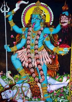Another deity central to Kali worship, including its mythology, is Bhadra Kali. It is told that thousands of years ago the demon Raktabija was graced with a boon from the god Shiva: each time a drop of his blood hit the soil, another Raktabija would emerge. Imbued with this power, the demon rebelled against the gods and tried to subjugate them. The latter tried to fight back, but each injury inflicted on the demon generated more demons until finally an uncountable number of Raktabijas had emerged. Alarmed, the gods first turned to the warrior goddess Durga, whose ferocious drive made the situation even worse, since the slaughter she unleashed generated thousands more demons. Enraged, Bhadra Kali emerged from her, a terrible form of the (already) ferocious Durga. Bhadra Kali, possessing diverse weapons, also had another talent: she could prevent Raktabija’s blood from striking the soil, sucking up each drop produced by the latter’s mortal wounds. As the battle unfolded, the goddess supplanted countless demons. In this way, Bhadra Kali acquired the taste for blood and began to destroy other things and beings, including the benign. The universe was once again in danger, this time due to Bhadra Kali. Mad with rage, the goddess destroyed everything and everyone. Only after Shiva, her consort, placed himself at her feet, as though he was one of her victims, did Bhadra Kali come to her senses and cease her destruction.