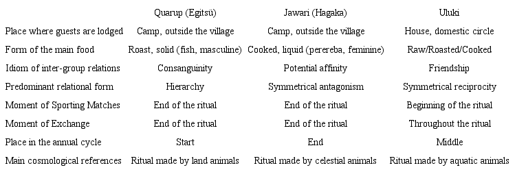 The hospitality of the uluki takes a different form. In spatial terms, the guests arrive directly in the patio, and are then lodged in a house within the village circle. Once there, they receive visits, and share fully in the day-to-day activities of their hosts, without the need for chiefly mediation. The temporality of the stages of the ritual also differs: the visiting chiefs offer gifts to the host chiefs; men fight, in an informal and casual manner; exchange is intense, and the circulation of objects of great value is anxiously awaited; the rituals that occur during the uluki enact the potential of the exchange of wives between the groups; and when the host chiefs return the gifts, the groups do not go their own ways, but remain a further day, eating together and celebrating.