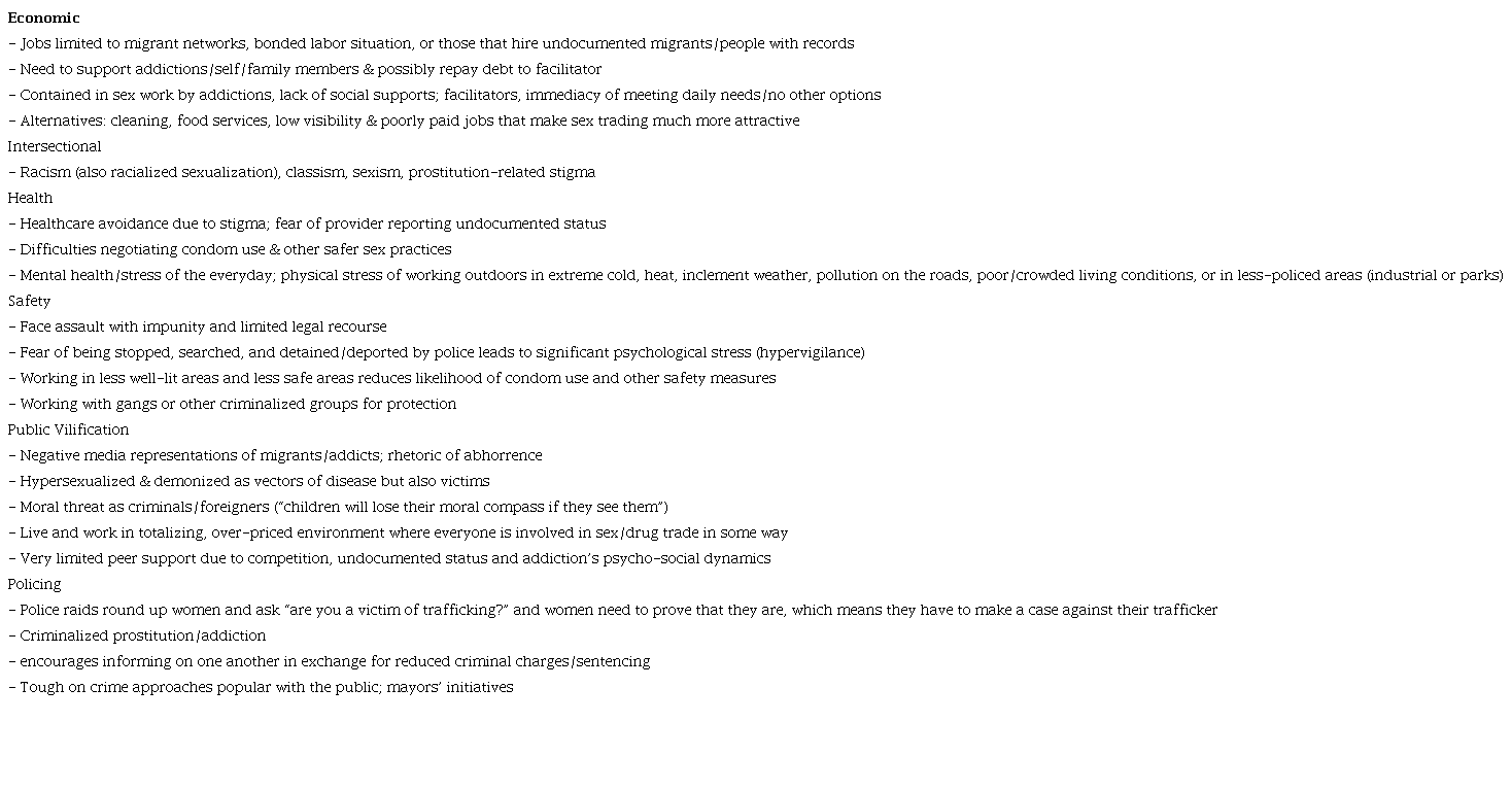 Control creep’s exclusionary effects squarely situate sex workers at the center of this perfect storm by targeting them as criminals while simultaneously exploiting their vulnerabilities as marginalized women with few socio-legal and other citizenship rights. Taken together, these exclusionary forces- in their totalizing economic, intersectional, health, safety, public vilification, and policing forms-position street-involved women within a vortex from which they find it very difficult to emerge. In this section we discuss more in details these six forms of exclusion, drawing on a combined analysis of our empirical data in conjunction with a survey of global prostitution research on these six dimensions. All six forms of exclusion intersect with one another in ways that have not been previously explored by researchers, who often focus on one or more aspects of these exclusions without consideration of how they operate contemporaneously as a whole. These exclusions derive from control creep’s increasingly pervasive exercise of policies, modalities, and encounters that stigmatize and oppress sex workers in a systematic and totalizing manner.