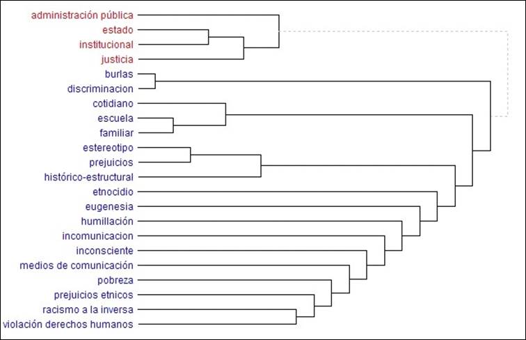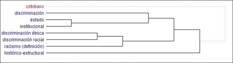 En los anexos que mostramos a continuación se puede observar algunos de los resultados que arrojan los análisis del Qdamniner y la interrelación de términos más frecuentes con los que se asocia el racismo y la discriminación. En los dendograma 2 y 3 se puede observar la estrecha interrelación del racismo y el racismo de Estado o de racismo y discriminación étnico-racial.