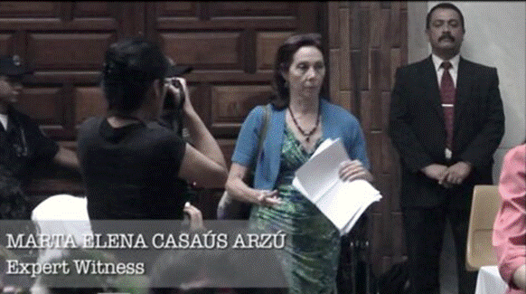 Durante el juicio, la fotografía de Marta Casaús fue exhibida como “terrorista” por su participación como perito, junto a los rostros de varias personas que hicieron posible el juicio histórico, tales como Yassmin Barrios, Claudia Paz y Paz y Rigoberta Menchú, entre otras mujeres valientes. Las fotografías exponían sus rostros de forma similiar a las imágenes de desaparecidos durante los años del conflicto interno armado en Guatemala, por lo que representaron amenazas frontales de muerte (Ruiz-Trejo, 2016).