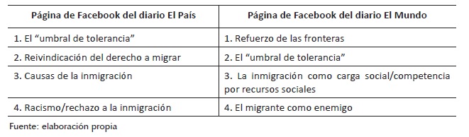 Los sucesos que motivaron las noticias (y su eco en RSV) analizadas en este trabajo, tienen que ver con la entrada de población migrante en situación administrativa irregular a través de la ciudad fronteriza de Melilla. Se trató, stricto sensu, de cientos de personas intentando entrar al mismo tiempo en territorio español a través de un valla de alambrada fortificada de unos 16 kilómetros de largo, con hasta 6 metros de altura, coronada con una concertina de cuchillas en la parte más alta. Esta forma de entrada irregular al país por parte de personas procedentes de países africanos comienza a producirse (paralelamente a la cobertura mediática de la misma) a finales de los años dos mil. Hasta entonces la vía marítima (a través de pequeñas embarcaciones: pateras, cayucos, etc.) había sido la más habitual y la más “mediatizada” (Olmos-Alcaraz, 2013) con respecto a este tipo de migraciones. En los días en los que se producen los hechos, los medios de comunicación en general -y las redes sociales en particular- se inundan de debates, tertulias, intervenciones de políticos, etc., sobre el fenómeno migratorio, que podemos resumir bajo el lema “Inmigración sí o inmigración no”. Es decir, el clamor general fue discutir sobre si España estaba, o no, a favor de los movimientos migratorios, y en qué términos y condiciones (Olmos-Alcaraz, Bouachra, 2014). Es por ello que resulta realmente interesante analizar los argumentos y tópicos más recurrentes esbozados en ese momento para pensar sobre las representaciones de alteridad sobre las migraciones y las nuevas lógicas de funcionamiento del racismo. Siendo así, como podemos observar en la Tabla nº 1, en las dos redes sociales analizadas, cuando se discute sobre la inmigración, el discurso oscila principalmente entorno a la idea de la existencia de un “umbral de tolerancia” del país. En el caso de la página de Facebook de El País además, y en segundo lugar, se habla del derecho a migrar (Derechos Humanos) y de las causas de la inmigración. En menor medida se emiten discursos racistas y de rechazo explícito hacia la inmigración. En el caso de los discursos encontrados en la página de Facebook de El Mundo, los cuatro tópicos más recurrentes encajan dentro de lo que Zapata-Barrero (2007) denomina “discursos reactivos” sobre la inmigración, discursos con una oposición clara y explícita al fenómeno migratorio, y que están en la línea de lo que se conoce como “el nuevo conservadurismo” (ibídem), y en ocasiones con tintes racistas explícitos.