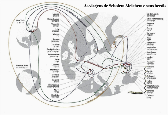 Este tipo de continuidade no tempo se estabelece também no espaço, posto que a leitura é o “produto itinerante de uma experiência material e concreta” em que os “leitores-viajantes” leem a si próprios, ao mesmo tempo em que, expostos às ideias contidas nos livros, são atraídos pelos desafios da alteridade ( Freijomil, 2009). Pelos livros, se vai, se vem e se passa ( De Certeau, 1969, p. 6). A própria escrita pode ser itinerante: “sempre em viagem, é em hotéis e estações ferroviárias que escreveram Proust, Wittgenstein, Nabokov” ( Steiner, Spire, 2000, p. 27). No caso da literatura yiddish, em paralelo à própria onda migratória, é visível a importância do deslocamento espacial de escritores, assim como de seus personagens (ver quadro abaixo). O escritor Scholem Aleichem escreveu romances ferroviários e epistolares. Entre seus personagens encontramos caixeiros viajantes, migrantes, missivistas e errantes. Em sua obra, o deslocamento não é apenas um tema, mas um modo de considerar o mundo, ilustrando o fato que, por sua capacidade de absorver influências dos contextos vividos, o yiddish teria o feitio de “uma língua-passaporte” ( Guinsburg, 1996, p. 35-36), que preservou a si própria numa dialética em que o fechamento imposto a seus locutores resultou, paradoxalmente, em abertura para o mundo.